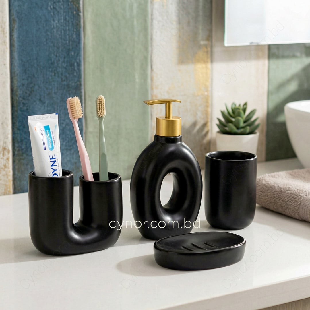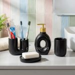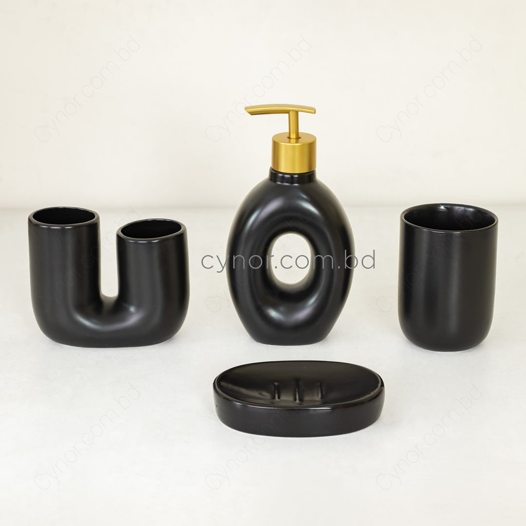 Upgrade your bathroom décor with this elegant 4-piece bathroom accessory set, crafted from high-quality porcelain ceramic and finished in a refined black tone. The smooth, glazed surface delivers a clean, minimalist look while ensuring durability, stain resistance, and easy maintenance;