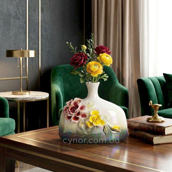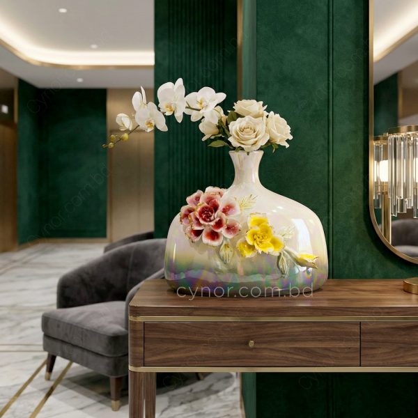 This luxury porcelain ceramic flower vase is ideal for displaying fresh flowers, artificial stems, or as a standalone decorative accent. Crafted with a refined ceramic body and finished with a glossy, colorful iridescent glaze, it reflects subtle, shifting tones that add depth and visual richness. Designed to elevate upscale interiors, this vase brings a sophisticated, elegant presence to living rooms, bedrooms, offices, console tables, or tabletop settings, complementing both modern and classic décor with a polished, high-end look.