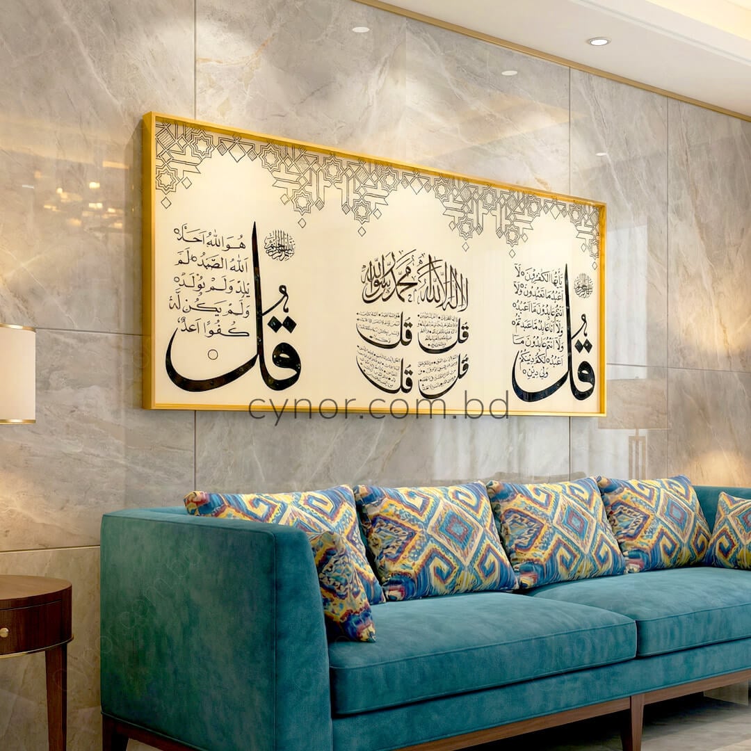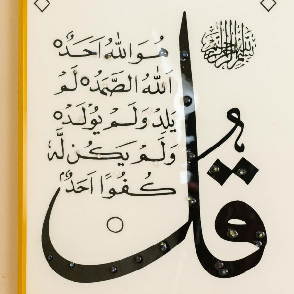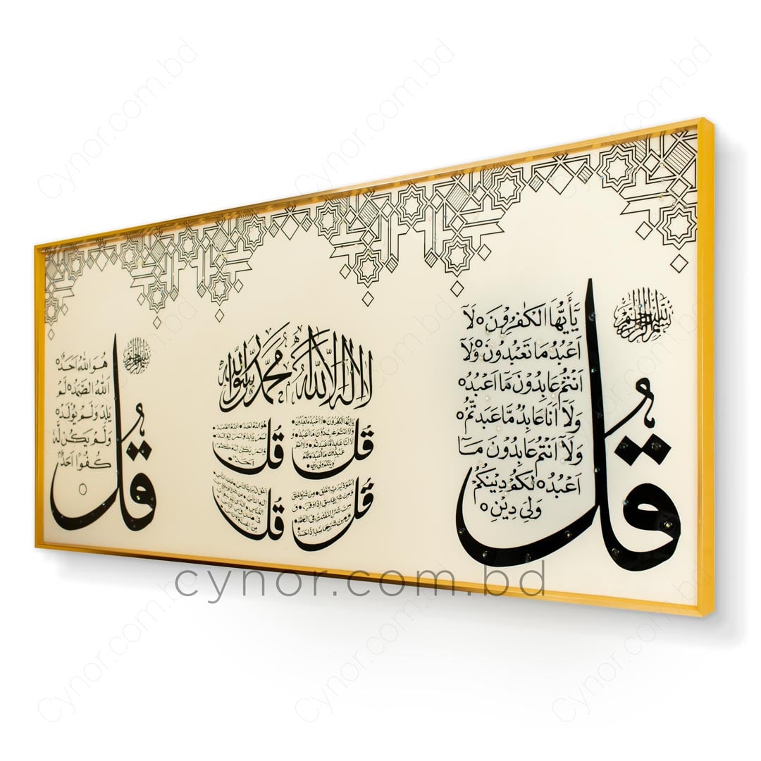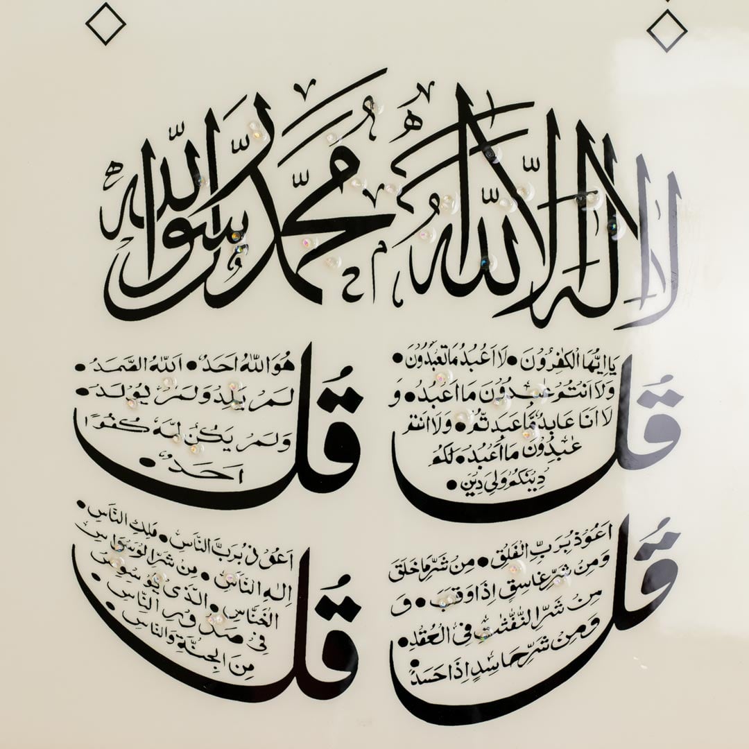 The 4 Quls Al-Kafirun, Al- Ikhlas, Al-Falaq and An-Nas calligraphy and geometric background are crafted with a premium resin and stone-inlay effect, adding depth, texture, and a luxurious handcrafted appearance;