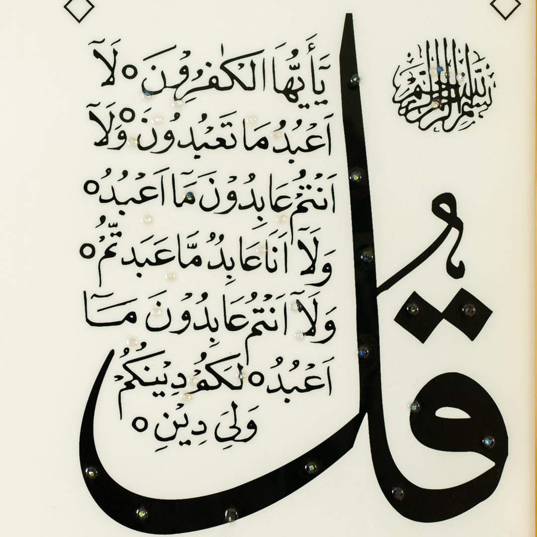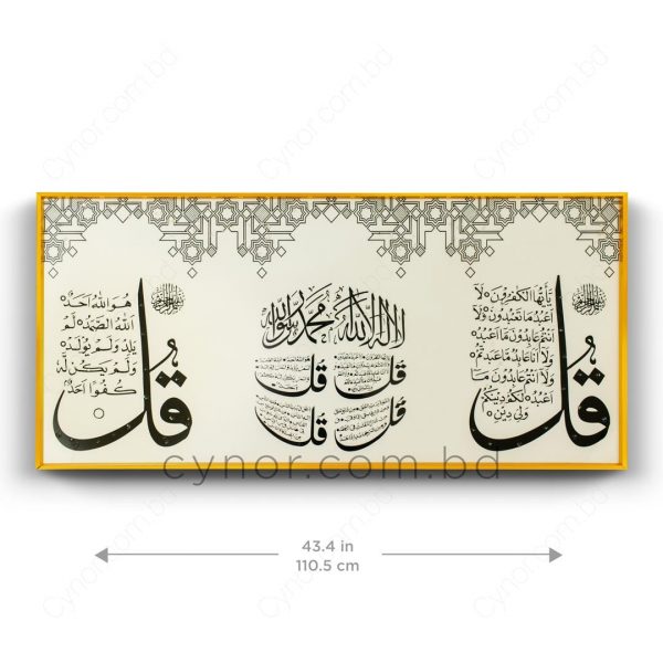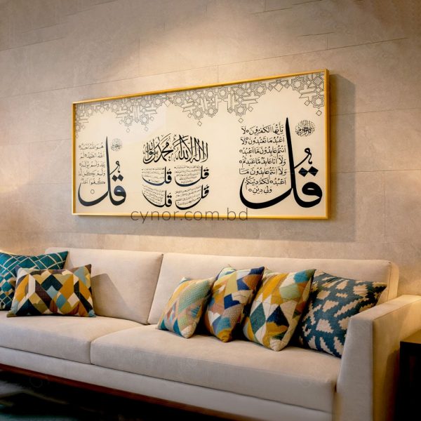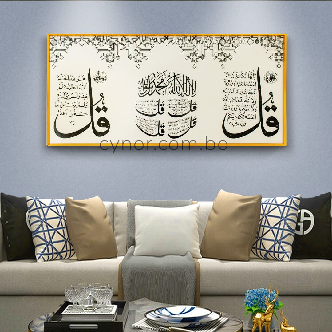 The 4 Quls Al-Kafirun, Al- Ikhlas, Al-Falaq and An-Nas calligraphy and geometric background are crafted with a premium resin and stone-inlay effect, adding depth, texture, and a luxurious handcrafted appearance;