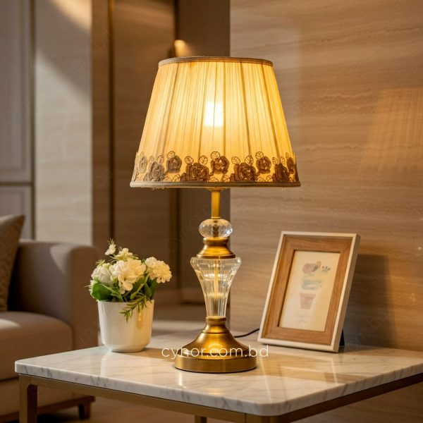 This table lamp showcases a refined modern design that blends metal and crystal elements with a soft fabric shade, bringing warmth and understated elegance to any interior. The solid metal and crystal body adds a touch of luxury, while the fabric shade gently diffuses light to create a comfortable, inviting glow;