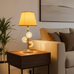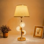 Golden Metal Table Lamp with Crystal Design and Decorated Cream Plastic ShadeGolden Metal Table Lamp with Crystal Design and Decorated Cream Plastic Shade