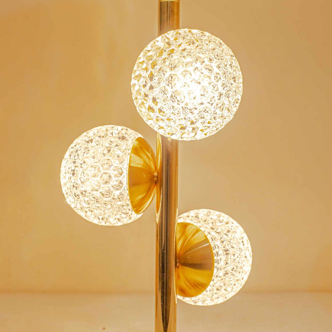 Overall, the lamp combines metal structure, crystal accents, and a decorated plastic shade to create a balanced design that feels refined, decorative, and suitable for modern or classic interiors alike.
