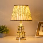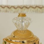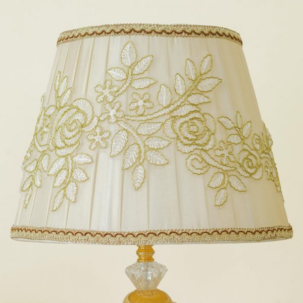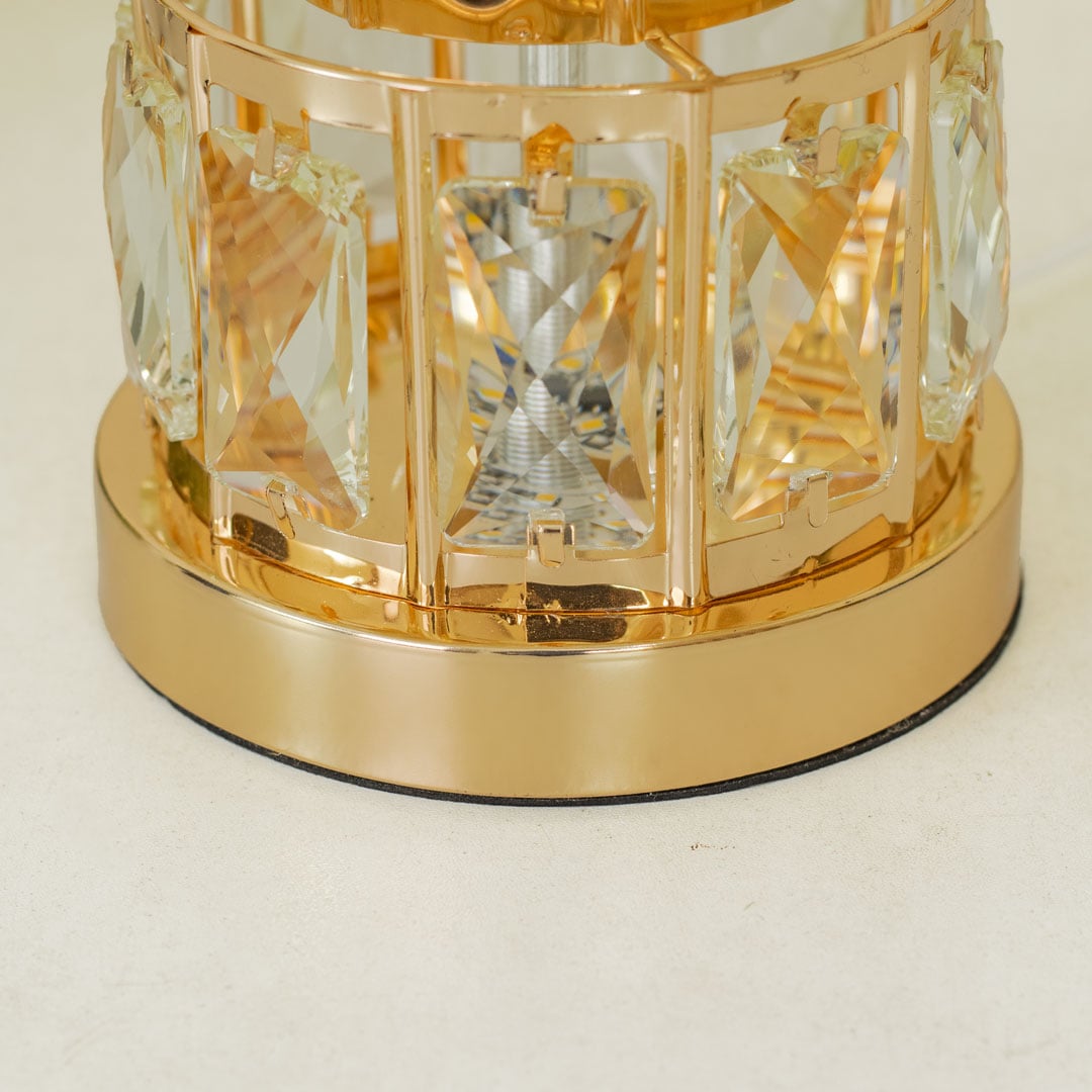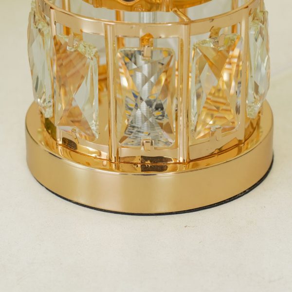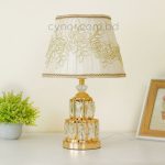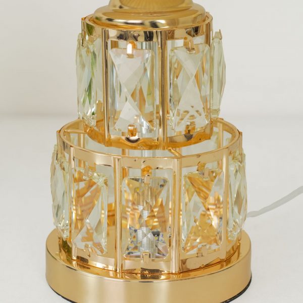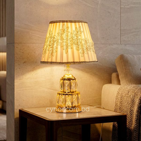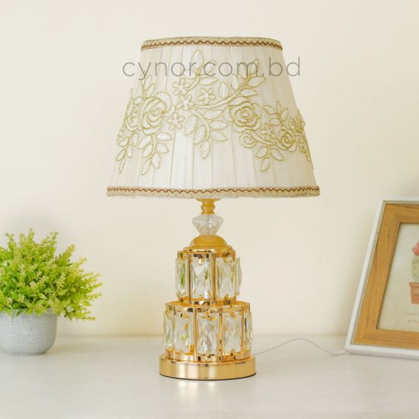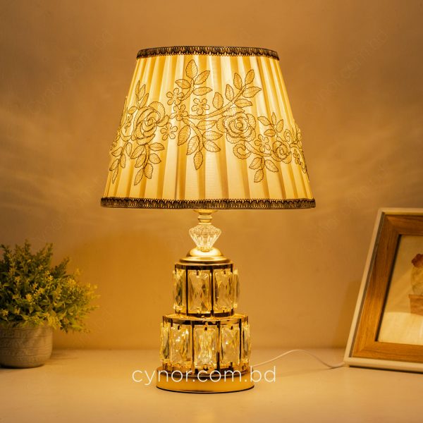 Golden Metal Table Lamp with Crystal Design and Floral Fabric ShadeGolden Metal Table Lamp with Crystal Design and Floral Fabric Shade