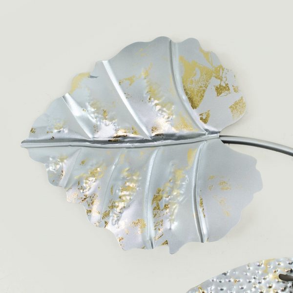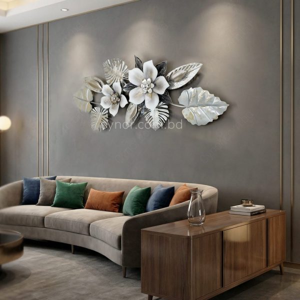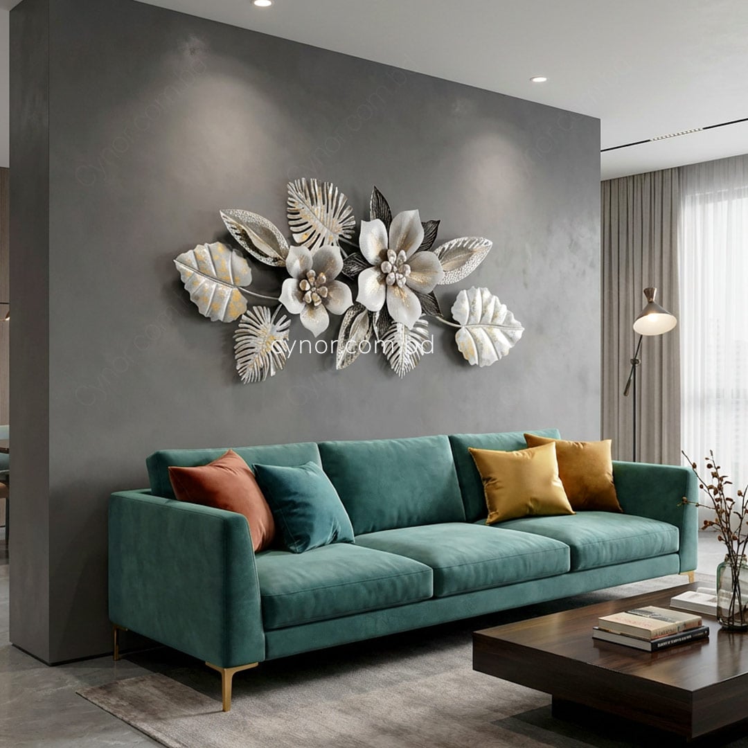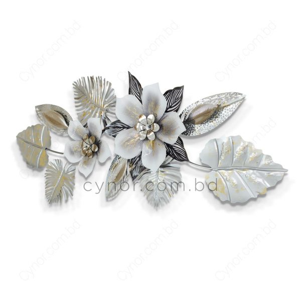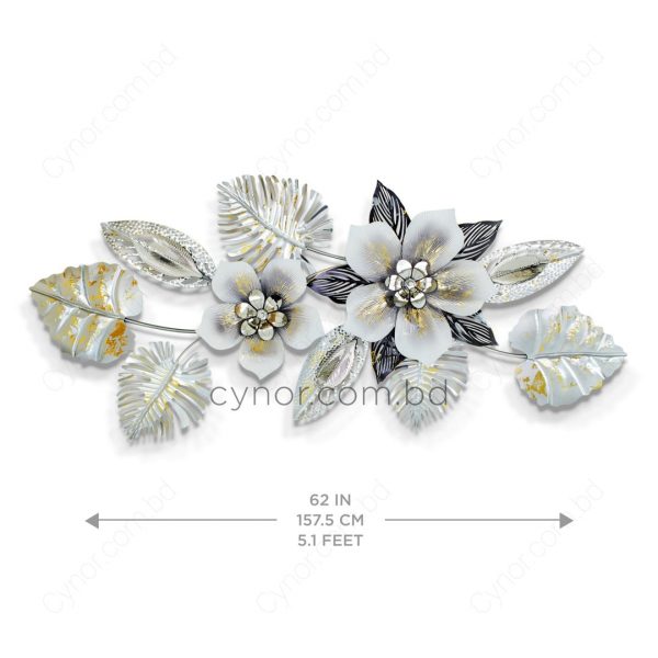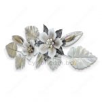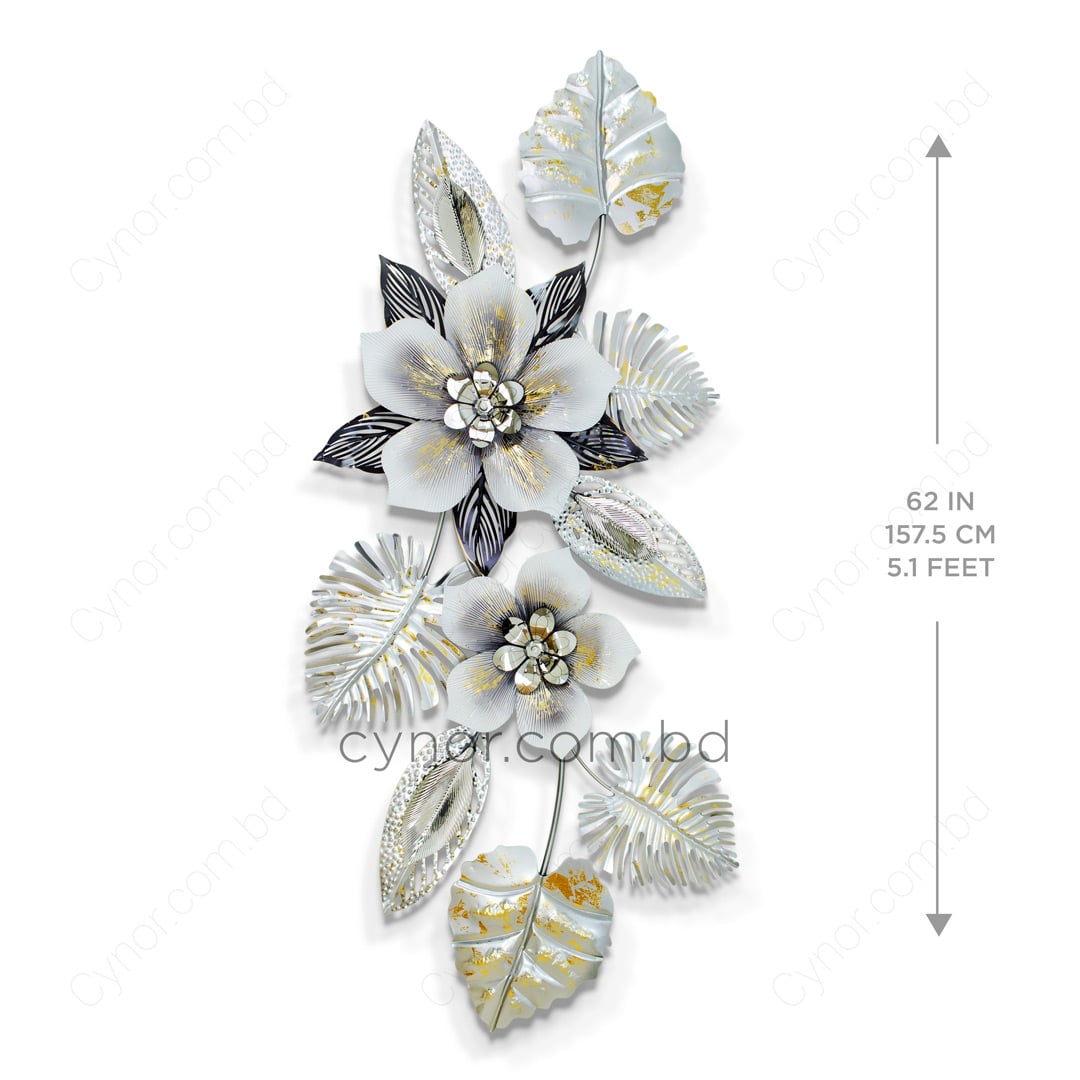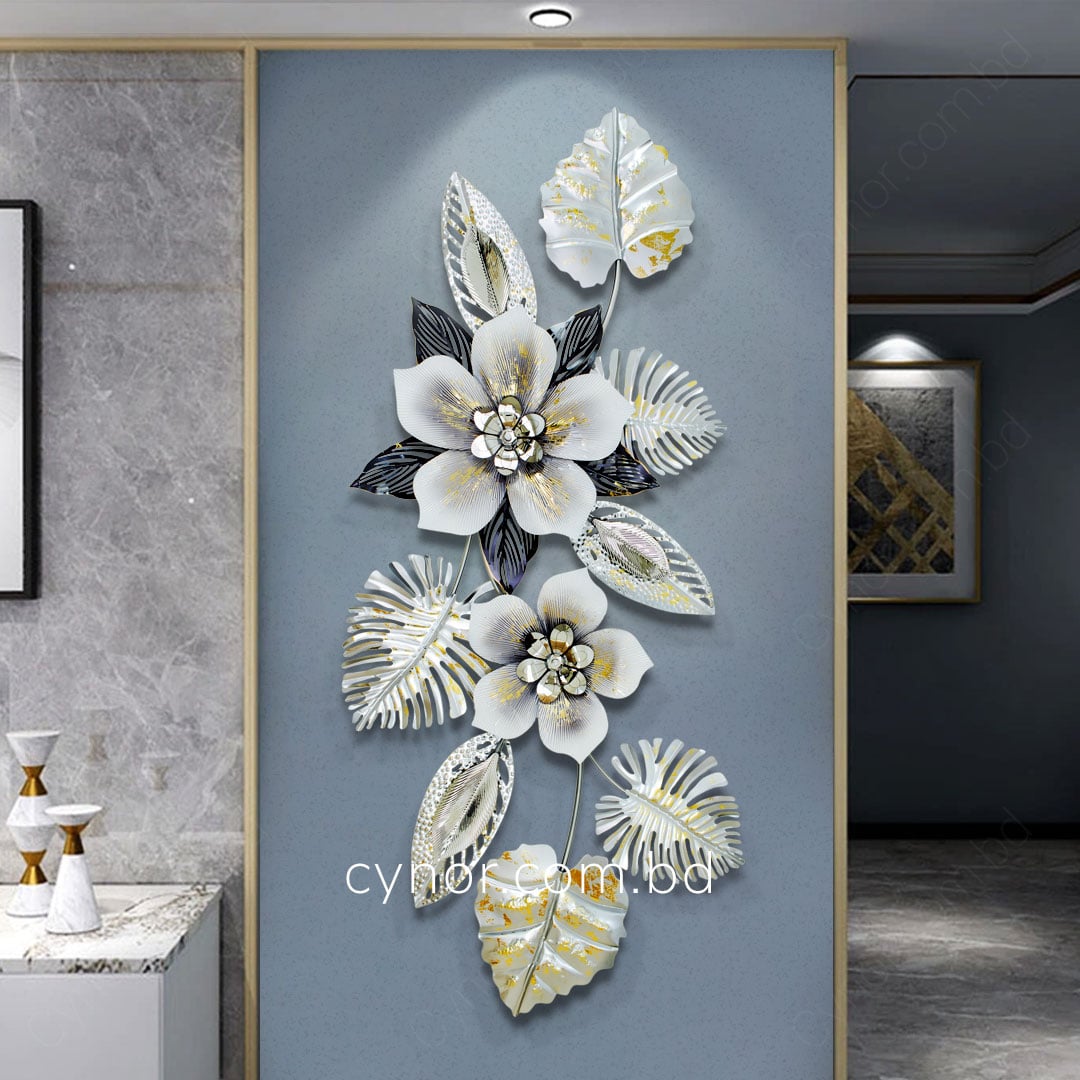 Features an elegant arrangement of layered metal flowers and leaves, creating a rich botanical statement for feature walls;