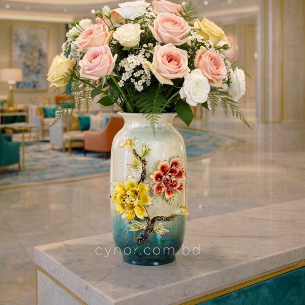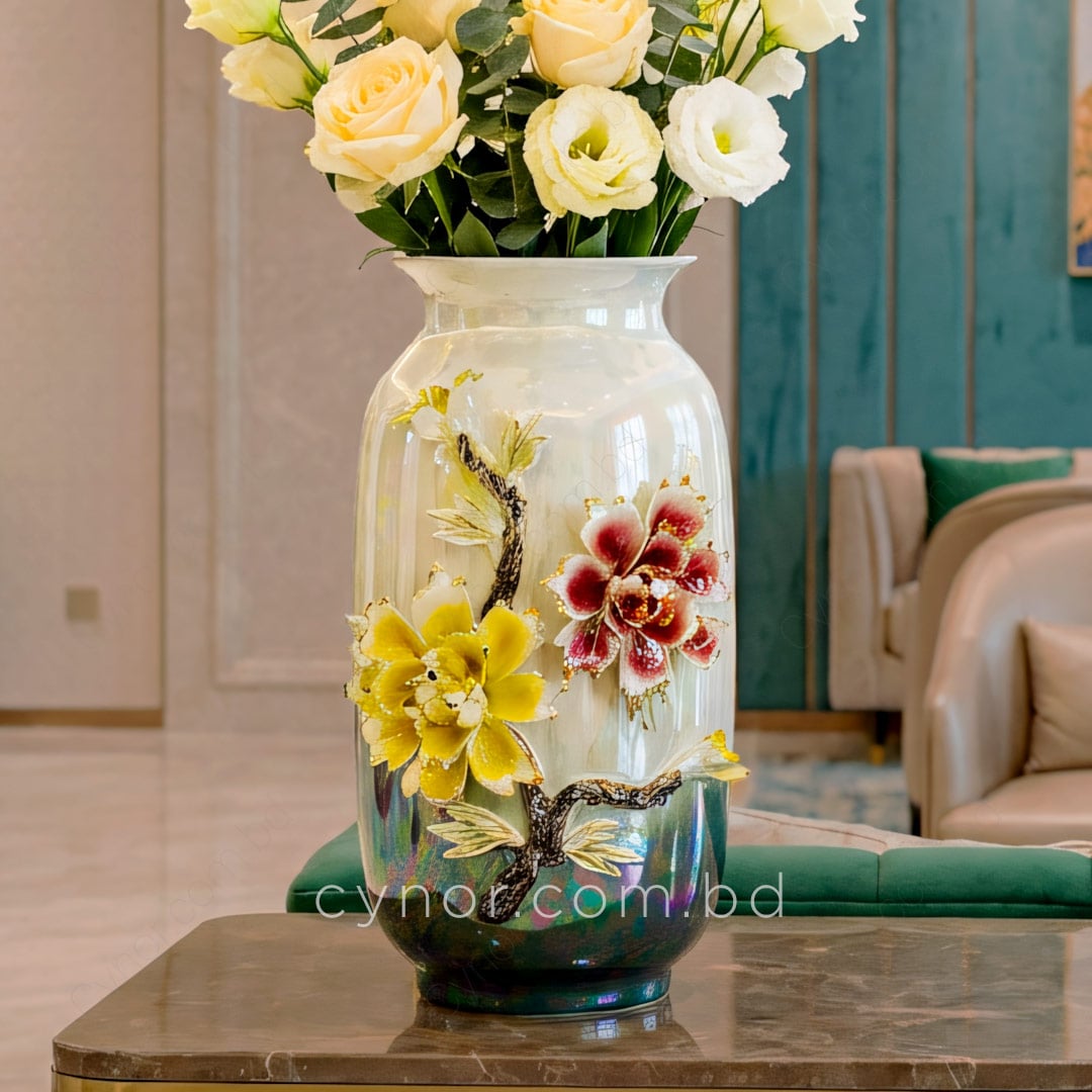 This luxury porcelain ceramic flower vase is ideal for displaying fresh flowers, artificial stems, or as a standalone decorative accent. Crafted with a refined ceramic body and finished with a glossy, colorful iridescent glaze, it reflects subtle, shifting tones that add depth and visual richness. Designed to elevate upscale interiors, this vase brings a sophisticated, elegant presence to living rooms, bedrooms, offices, console tables, or tabletop settings, complementing both modern and classic décor with a polished, high-end look.