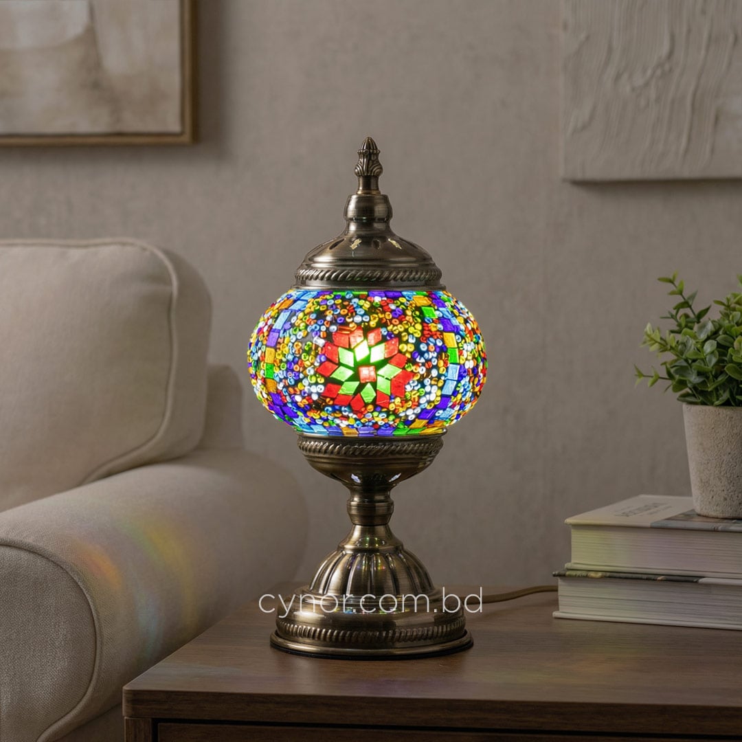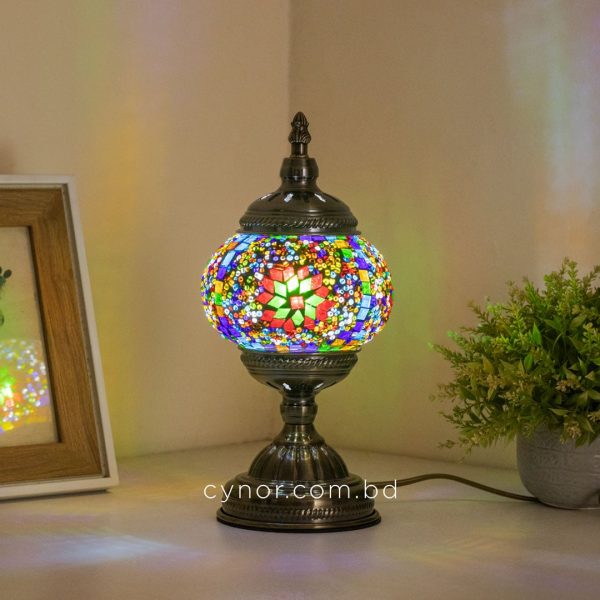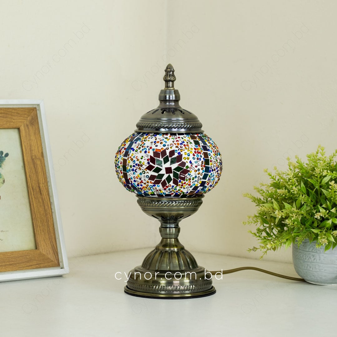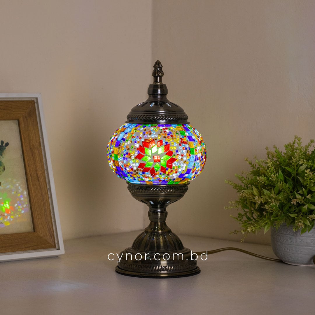 Bring timeless elegance and warm ambiance to your space with this beautifully crafted Turkish inspired mosaic table lamp. Featuring a sturdy metal body and vibrant multicolor glass mosaic stones, this lamp reflects traditional Turkish artistry while blending effortlessly with modern and classic interiors. When illuminated, the mosaic glass creates a soft, colorful glow that enhances the mood of any room.