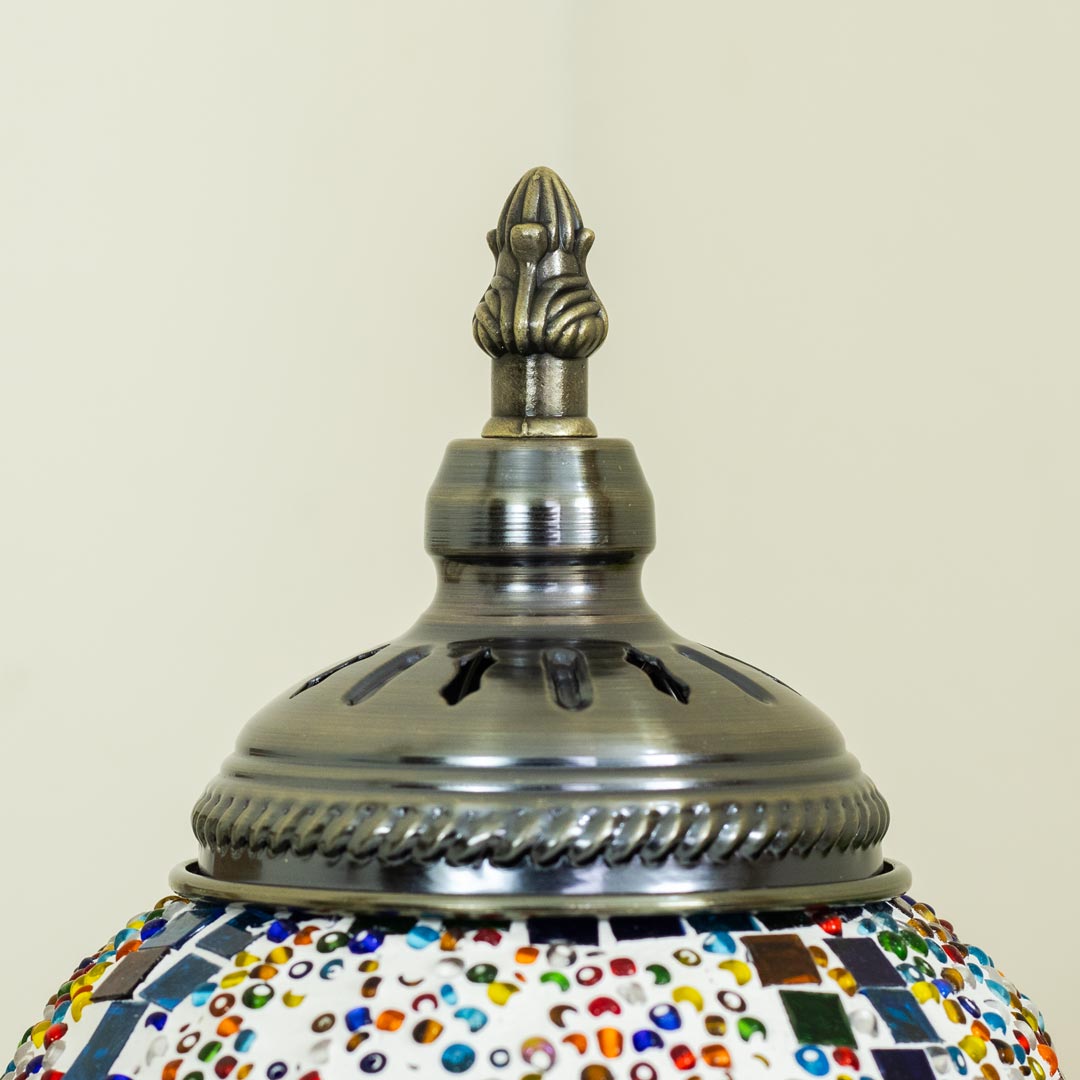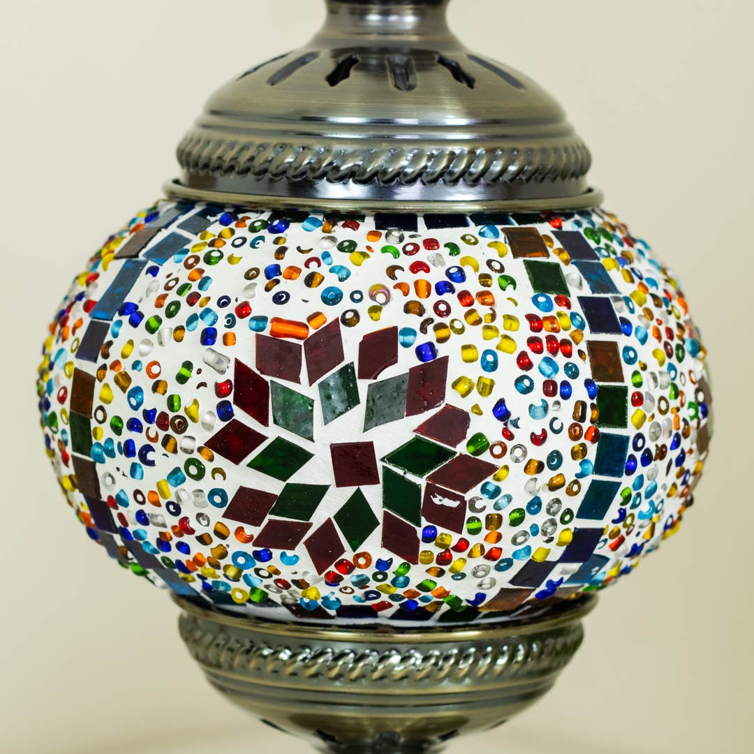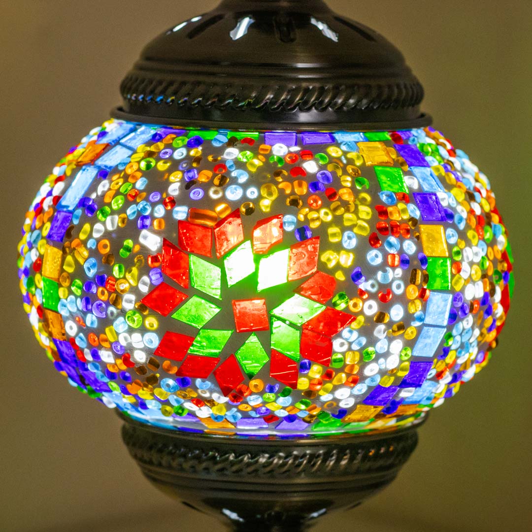 Bring timeless elegance and warm ambiance to your space with this beautifully crafted Turkish inspired mosaic table lamp. Featuring a sturdy metal body and vibrant multicolor glass mosaic stones, this lamp reflects traditional Turkish artistry while blending effortlessly with modern and classic interiors. When illuminated, the mosaic glass creates a soft, colorful glow that enhances the mood of any room.