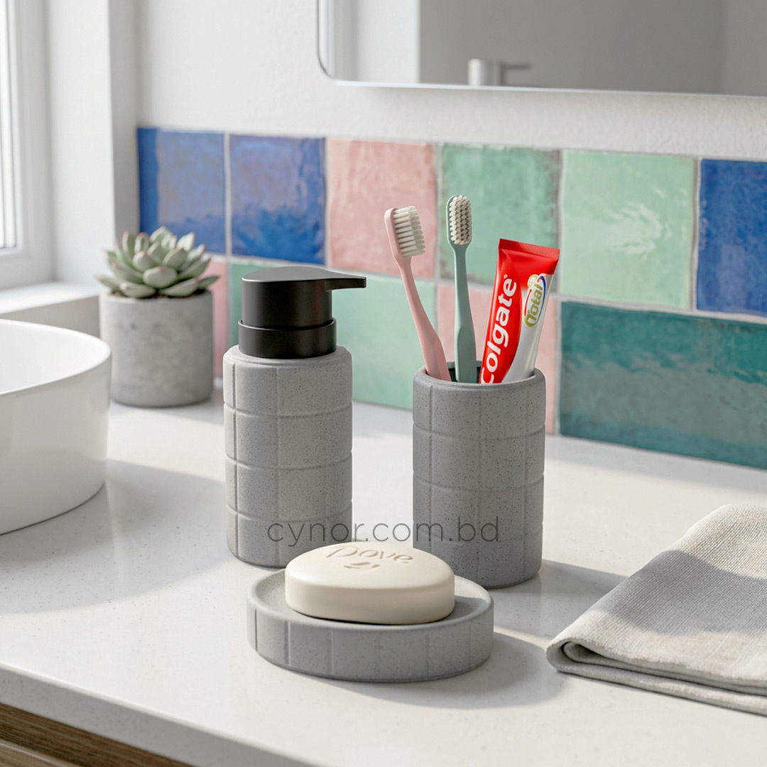 The set includes a hand wash dispenser with a sturdy plastic cap for smooth and controlled dispensing, a compact brush holder, and a well-proportioned soap tray. Its timeless design blends effortlessly with modern, contemporary, or classic bathroom interiors, making it an ideal choice for homes, guest bathrooms, and hotel use;
