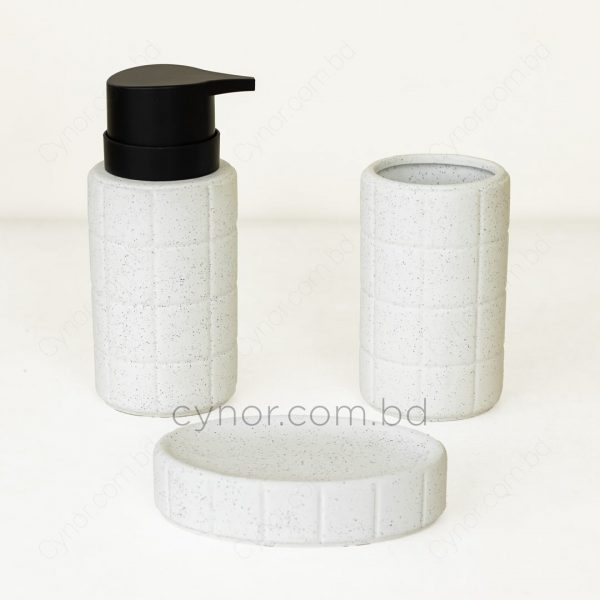 The set includes a hand wash dispenser with a sturdy plastic cap for smooth and controlled dispensing, a compact brush holder, and a well-proportioned soap tray. Its timeless design blends effortlessly with modern, contemporary, or classic bathroom interiors, making it an ideal choice for homes, guest bathrooms, and hotel use;