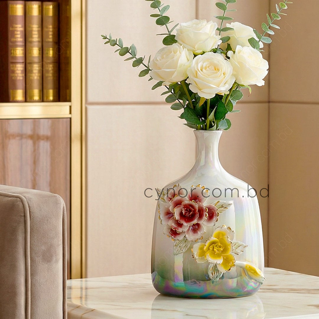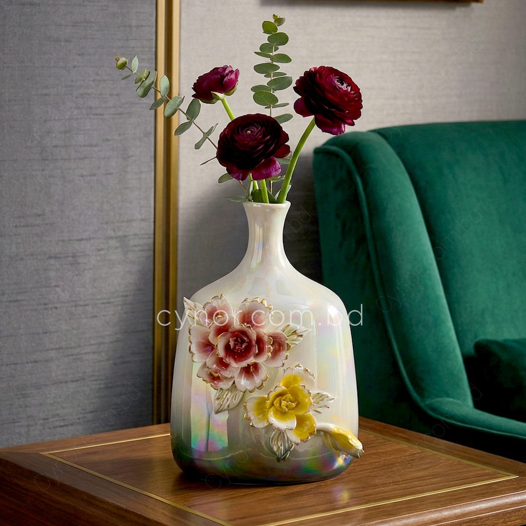 This luxury porcelain ceramic flower vase is ideal for displaying fresh flowers, artificial stems, or as a standalone decorative accent. Crafted with a refined ceramic body and finished with a glossy, colorful iridescent glaze, it reflects subtle, shifting tones that add depth and visual richness. Designed to elevate upscale interiors, this vase brings a sophisticated, elegant presence to living rooms, bedrooms, offices, console tables, or tabletop settings, complementing both modern and classic décor with a polished, high-end look.