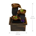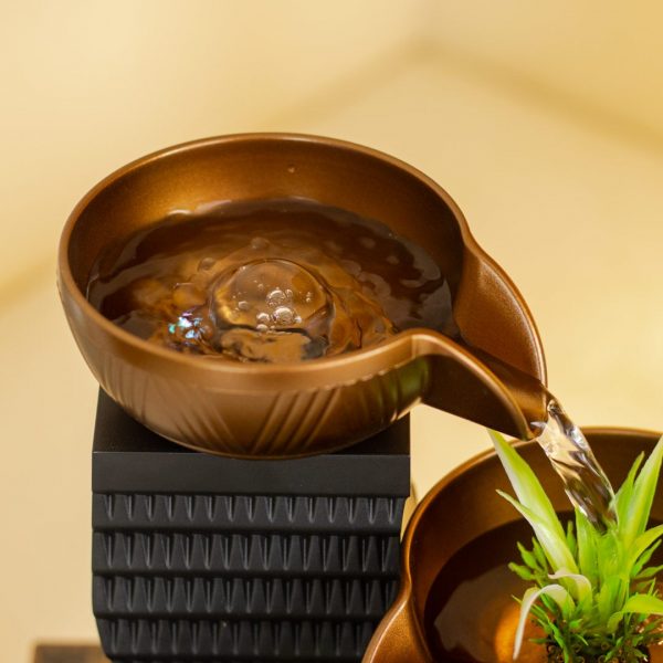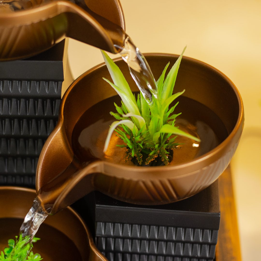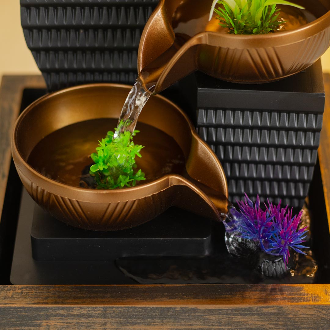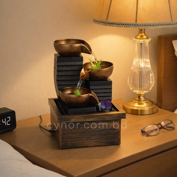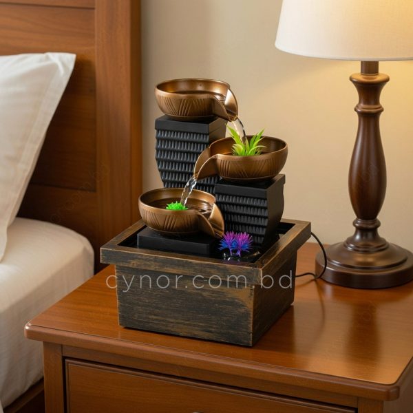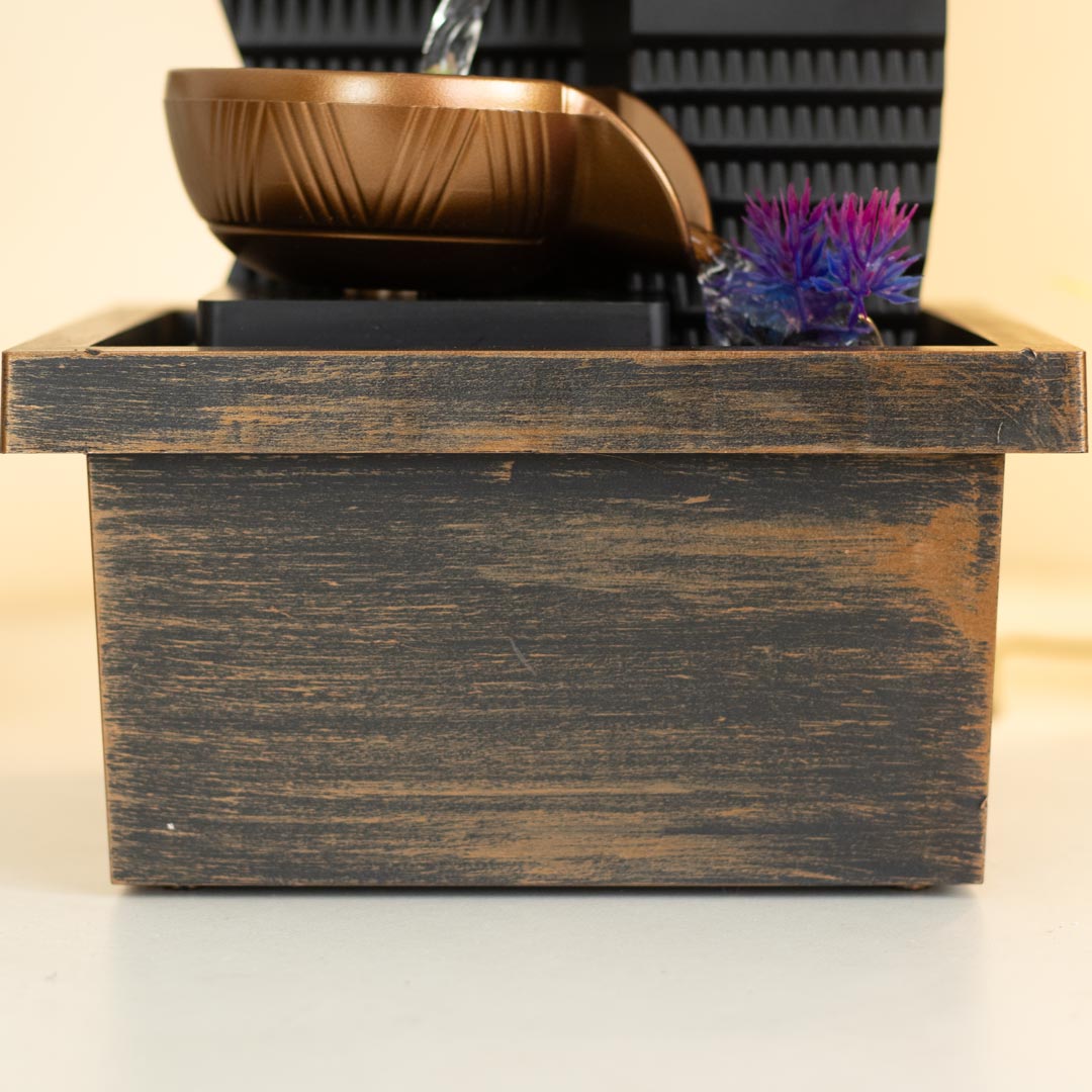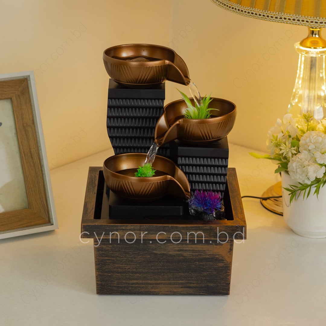 This tabletop fountain features a multi-tier cascading water design crafted from durable plastic with a realistic textured wood-like finish, designed to resemble natural burnished wood. Water gently flows from the top stone-style bowl down through layered basins, creating a soothing visual flow and a calming, continuous water sound.