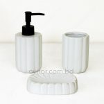 The set includes a hand wash dispenser with a sturdy plastic cap for smooth and controlled dispensing, a compact brush holder, and a well-proportioned soap tray. Its timeless design blends effortlessly with modern, contemporary, or classic bathroom interiors, making it an ideal choice for homes, guest bathrooms, and hotel use;