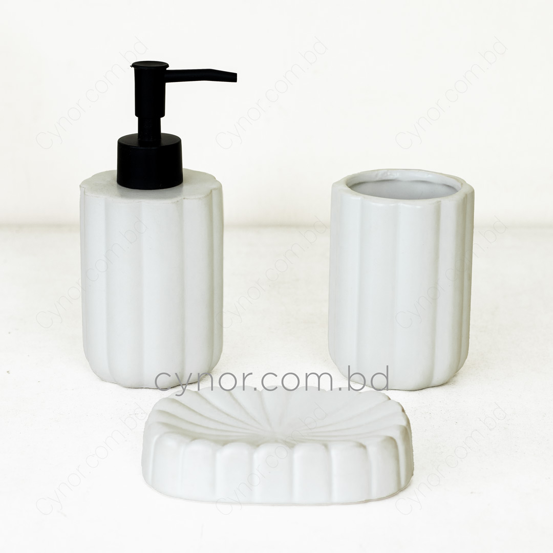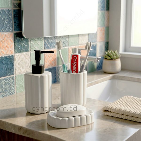 Upgrade your bathroom décor with this elegant 3-piece bathroom accessory set, crafted from high-quality porcelain ceramic. The smooth, glazed ceramic surface delivers a clean, minimalist aesthetic while ensuring durability, easy maintenance, and long-lasting everyday use. Thoughtfully designed for convenience, this set keeps your bathroom essentials organized and within easy reach, adding both style and functionality to your countertop;